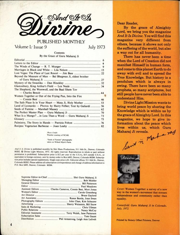 'And It Is Divine' was the name of this colour magazine published by Divine Light Mission in the USA from November 1972 until the late 1970's when it was replaced by 'Élan Vital'. Before 1974 every copy carried a signed manifesto by Sant Ji Maharaj stating "There has never been a time when the Lord of Creation did not manifest Himself in human form, and come to this planet Earth to do away with evil and spread the True Knowledge.