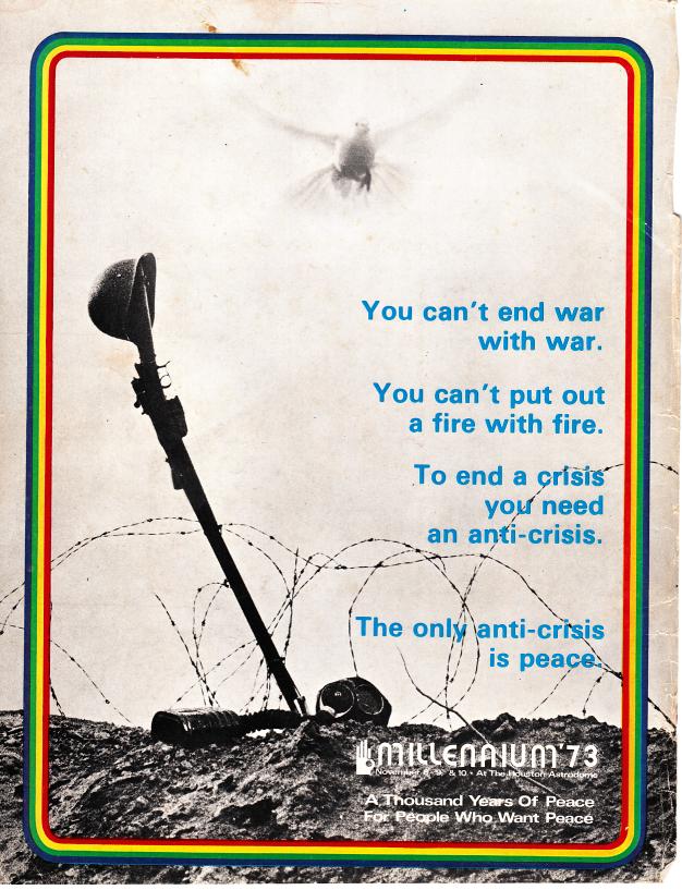 A caravan of five hundred people will travel all the way from Boston to Houston, stopping in cities along the way, holding parades, giving special public: programs, speaking to civic groups and churches, and going door to door with their invitation of peace, the brightest message that one person has ever given another.