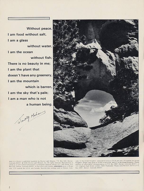 'And It Is Divine' was the name of this colour magazine published by Divine Light Mission in the USA from November 1972 until the late 1970's when it was replaced by 'Élan Vital'. It began as a monthly magazine attempting to carry a wide spectrum of articles relating to the wider alternative culture with highbrow pretensions and ended the same as all other Divine Light Mission magazines printing pictures and speeches of Prem Rawat's or his immediate family or close followers.