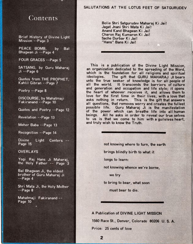 This is a publication of the Divine Light Mission, an organization dedicated to the spreading of the Word, which is the foundation for all religions and spiritual ideologies. The gift that GURU MAHARAJ JI bears unto the true seeker of knowledge is for all people of all the world. It transcends the barriers of culture and generation and occupation and life style; it opens the heart of whoever receives it, and allows them to love for the first time in their lives, with a love that asks nothing in return. This is the gift that answers all questions, that removes worry and creates the fullest possible life. Guru Maharaj Ji is the manifestation of the power which can breathe life into all human beings. All he asks in order to reveal our true selves to us is that we come to him with a guileless heart, and truly wish to know the Truth.