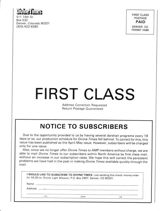 Also, since we no longer offer Divine Times to AMP members without charge, we are able to mail Divine Times to our subscribers within North America by first class mail, without an increase in our subscription rates. We hope this will correct the persistent problems we have had in the past in making Divine Times available quickly through the mail.