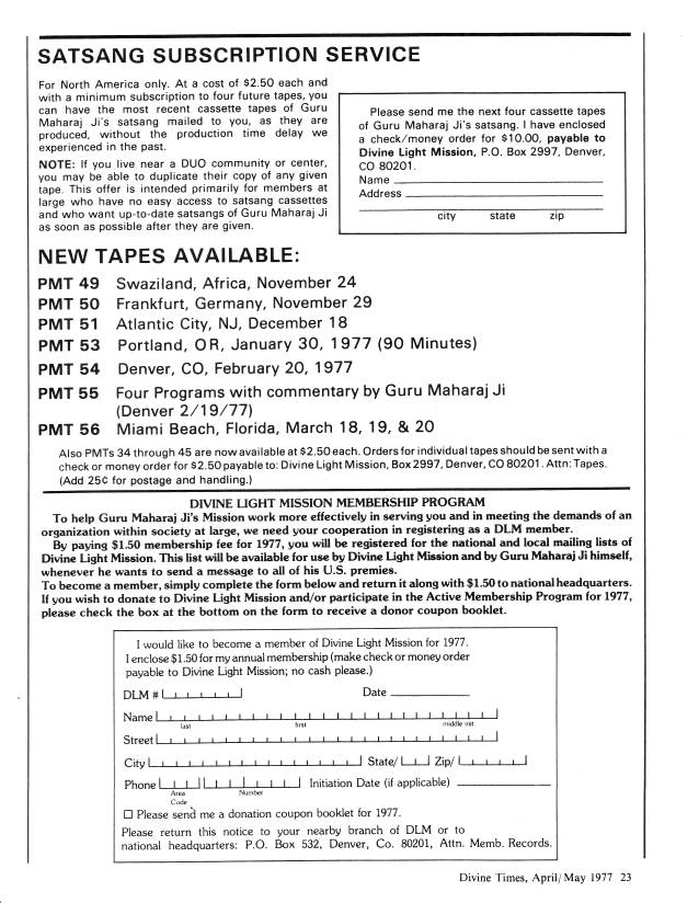 By paying $1.50 membership fee for 1977, you will be registered for the national and local mailing lists of Divine Light Mission. This list will be available for use by Divine Light Mission and by Guru Maharaj Ji himself, whenever he wants to send a message to all of his U.S. premies.