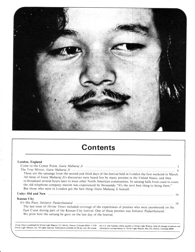 These are the satsangs from the second and third days of the festival held in London the first weekend in March. All three of Guru Maharaj Ji's discourses were heard live by many premies in the United States, and then re-broadcast several hours later to most other North American communities. In satsang halls from coast to coast, the old telephone company maxim was experienced by thousands: "It's the next best thing to being there." But those who were in London got the best thing: Guru Maharaj Ji himself.