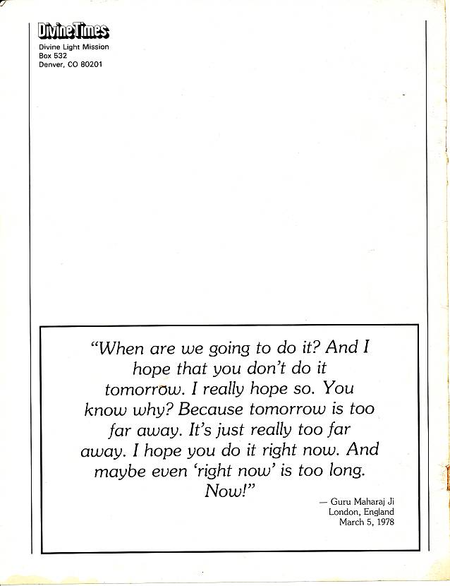 "The long end of the cross led back into a simple white pavilion where soon Maharaj Ji was giving darshan. Hour after hour a thin line of barefoot premies moved carefully up the sand path that had been created for that purpose alone. Up a little hill, and into Guru Maharaj Ji's world. Then they staggered or floated or wobbled or danced or flew or sailed or were carried back down the other side. Many were helped into a little "recovery" tent, others returned to listen to more satsang from the initiators while tears dropped joyfully down their cheeks."