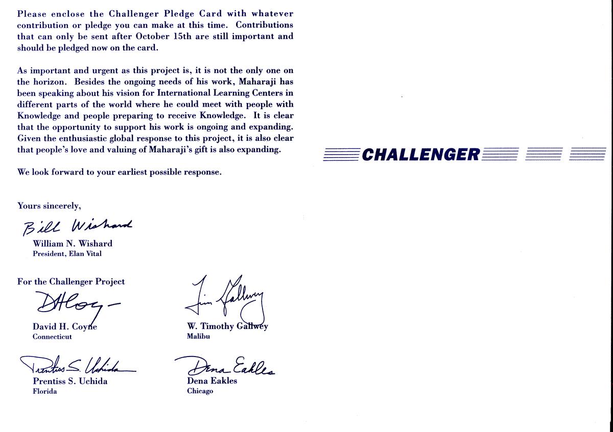 This letter brings sincere and heartfelt thanks to ail who made the Challenger acquisition possible. It is also an urgent request to return the enclosed pledge envelope as soon as possible, indicating your commitments both for sponsorship support and for the retirement of the Challenger loans. Just prior to the Rome event, at an international Organizers Conference in that city, North America must announce to Maharaji and the other countries how much can be counted on from us in 1991. Your response is the only basis this year for declaring that support. We will keep you informed with periodic updates on the progress of both the Sponsorship contributions and the Challenger loan retirement.