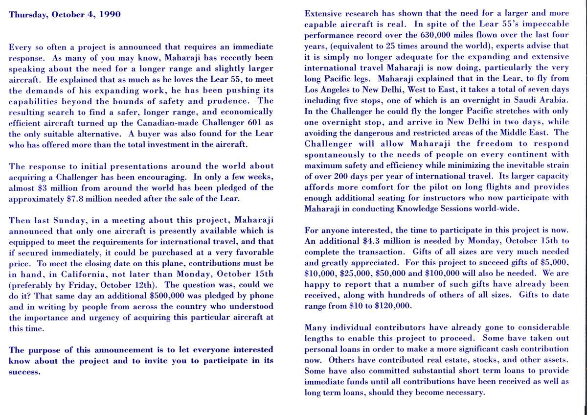 October 19, 1990 marked an important milestone in Maharaji's work with the acquisition of the Challenger 601. Maharaji is clearly delighted with the quality and capabilities of the aircraft, as well as with the depth of support from ail those around the world who contributed towards it. After flying the Challenger to Los Angeles from the closing, he said the best way to celebrate the occasion was to begin immediately to use it for its intended purpose. Since then he has made surprise visits at local events in North America, and confirmed a seven city tour of India for the first weeks in November as well as the three-day event in Rome in early December.