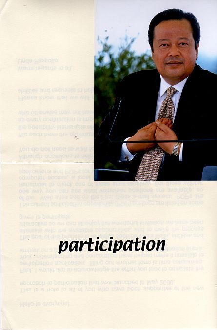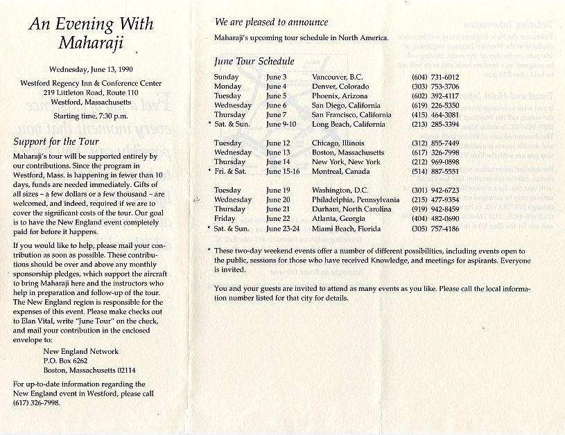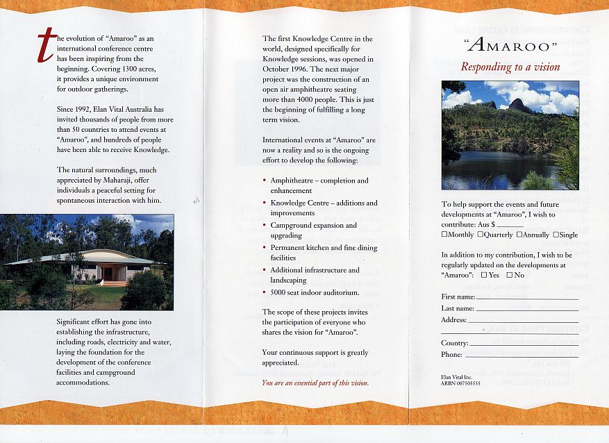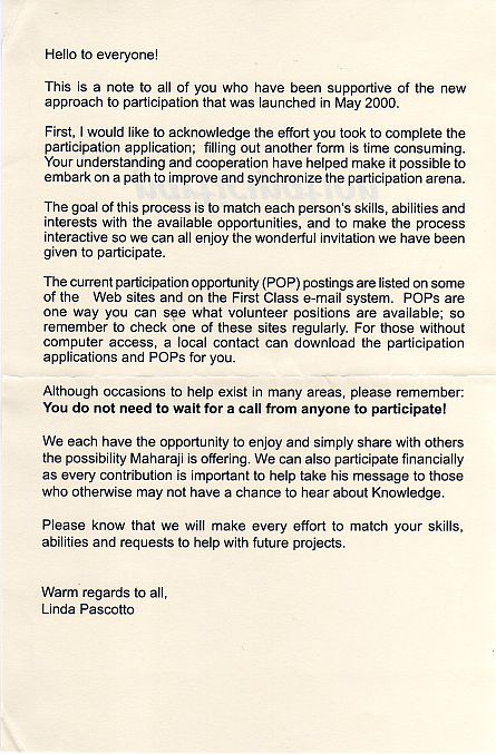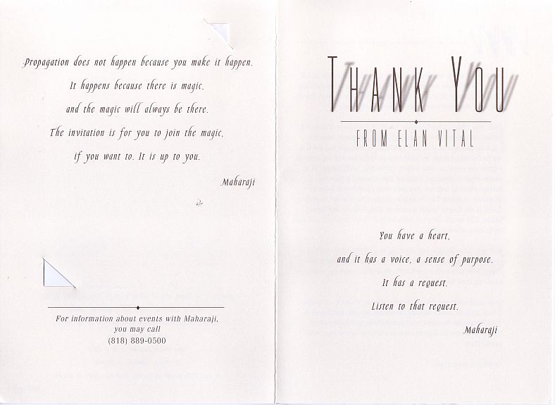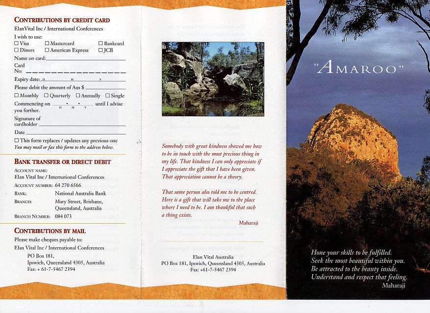 Funds donated to to the registered charities, formerly Divine Light Mission, Élan Vital and now including Words of Peace Global, Words of Peace International, Human Development Through Self-Knowledge and a host of national organisations, provide the expenses for this travelling and the travelling provides the inspiration for the donations that provide the expenses in an Ourobouros circle. Over the last 25 years the cost of attracting each new long term member must have reached quite a significant figure. Rawat claims to have a unique method to teach his students and a unique power to inspire them but his organisations use standard techniques of raising funds. The individual touch is to provide annual, exclusive "gifts" to the regular contributors of photos of him and CDs of "poetic"excerpts of his speeches sometimes set to muzak with songs performed by his more talented followers and one of his daughters.