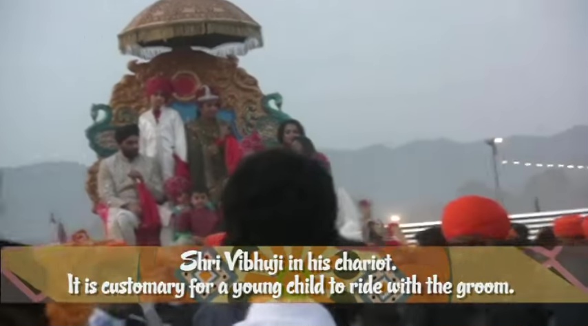 On October 23, 2012, Shri Vibhuji, son of Satgurudev Satpalji Maharaj (Defense Minister of India and spiritual leader) and Mata Shri Amritaji, married Aradhya, daughter of Thakur Shri Virender Singh (politician and M.P.) The wedding was conducted according to ancient Vedic rites, sweetened with the folk culture and traditions of the Himalayan Garhwal region. It was attended by nearly 150,000 people, from all religions and walks of life - from farm laborers to Indian political leaders and foreign diplomats. This is a small glimpse into a multiple day celebration surrounding this occasion. - IMBD synopsis of The Wedding of the Century.